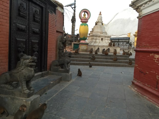 However, the peacefulness and serenity is easily disturbed by monkeys. It’s aptly named ‘Monkey Temple’. They are absolutely everywhere in all shapes and sizes. Not forgetting that they’re quite aggressive, as well as mischievous. At one point, one of cheeky buggers clutched onto Lauren, a fellow volunteer and hissed at her menacingly. We thought we were on thin ground and had to ‘jam jam’ (get a move on in Nepali) from the area.